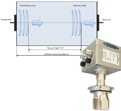 Das US-ICC TOF 1500 arbeitet nach dem sogenannten Time-of-Flight-Prinzip (TOF). Dabei werden Schallimpulse im niedrigen Kilohertz-Bereich durch das Messmedium geschickt. Die Zeit, die ein Ultraschallimpuls benötigt, um eine definierte Strecke im Medium zurückzulegen, wird präzise gemessen.