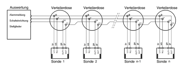 Das vom Sensor ausgebildete elektrische Feld entsteht direkt an der Unterseite des Gehäuses. Es genügt daher bereits ein geringer Flüssigkeitsfilm auf der Oberfläche, um dieses elektrische Feld zu ändern, was vom Sensor wiederum erfasst wird. Mit Hilfe eines potentialfreien Ausgangskontakt wird dann ein Alarm oder die automatische Unterbrechung der Flüssigkeitszufuhr ausgelöst. Eine herausragende Besonderheit dieses kapazitiven Bodensensors ist die einfache Verkettung mehrerer Sensoren in einer Reihenschaltung. So können große Flächen Punktuell überwacht und an einer zentralen Einheit ausgewertet werden.