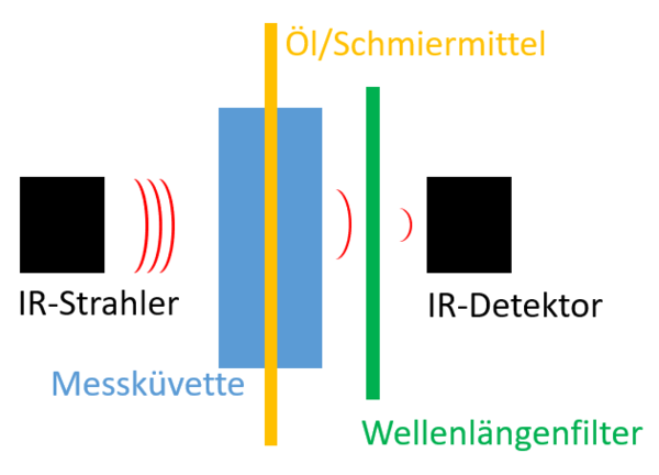 Der Ölzustandssensor FluidIX Lub-6 von Fluid.iO hingegen funktioniert auf Basis der optischen NDIR-Technologie (nicht-dispersive Infrarottechnologie). Bei diesem Messverfahren wird nicht das gesamte Infrarotspektrum betrachtet, sondern lediglich die spektralen Banden, welche die Ölalterung widerspiegeln. Das funktioniert durch vorherige Festlegung von Wellenlängenfiltern. Sobald Öl durch den Sensor gepumpt wird, kommt es mit der Messküvette in Berührung und wird von einem IR-Strahler durchleuchtet. Da die im Öl vorhandenen Moleküle das Infrarotlicht bei bestimmten Wellenzahlen aufgrund ihrer typischen Bindungsformen unterschiedlich stark absorbieren, wird so ein Teil des Lichts nicht weiter übertragen. Der andere Teil des transmittierten Lichts trifft anschließend auf die Wellenlängenfilter, die es nur einem schmalbandigen Bereich ermöglichen ungehindert zu passieren. Dieser Bereich wird dann vom IR-Detektor erfasst und so eine Intensitätsmessung der jeweiligen Bande durchgeführt.