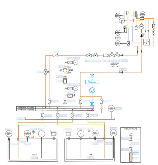 Der Sensor wurde hierfür zuvor in die Rücklaufleitung zwischen Tank und Motor des BHKWs eingebaut. Diese Rücklaufleitung vom Motor versah der Anlagenbetreiber mit einem T-Stück; an den Abgang installierte er einen Absperrhahn, den Ölsensor selbst, die Pumpe, sowie einen weiteren Absperrhahn in Reihe. Die Abflussleitung wurde dabei mit einem saugseitigen Ventilbalken verknüpft.