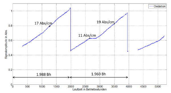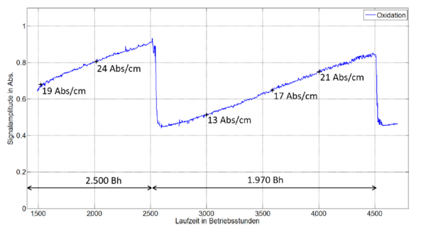 Der Einbau des Sensors erfolgte nach einer Laufzeit von 328 Betriebsstunden (Bh). Der erste Ölwechsel wurde nach Ablauf von 1.988 Bh durchgeführt, nach weiteren 1.960 Bh folgte ein erneuter Ölwechsel. Nach jedem Ölwechsel ist der Oxidationswert stets gering, nimmt jedoch mit zunehmender Einsatzzeit im BHKW zu.Außerdem wurden zwischenzeitlich (bei Betriebsstunde 2.600) Wartungsmaßnahmen im BHKW vorgenommen, weshalb die Anlage kurzzeitig still stand und die Oxidation fast unverändert blieb. Die Ergebnisse der externen Laboranalysen sind mit Stern (*) am Graphen gekennzeichnet. Um den Bereich von 4.000 Bh war keine Datenaufzeichnung möglich, da der FluidIX Lub-6 vorübergehend ausgebaut war.