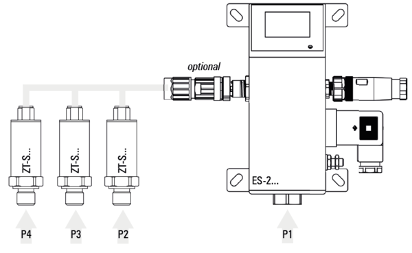 The ES series can be expanded into a centralised measurement and control system in machines and systems by means of measuring channel and switching channel expansion. The device can monitor up to four independent pressure circuits, for which specially developed SIL 2-capable pressure transmitters (ZT-S) are connected to the ES device via a secure communication interface. The ESE expansion box developed by ZILA can be connected directly to an ES-2x device in order to expand the electronic safety switching device with additional switching channels.