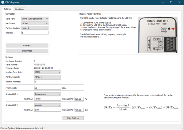 The sensor is configured using the USB kit and the associated PC software. The software also displays live measurement data. The sensor is connected to the PC via a USB kit that converts the ModBus RTU signals to USB.