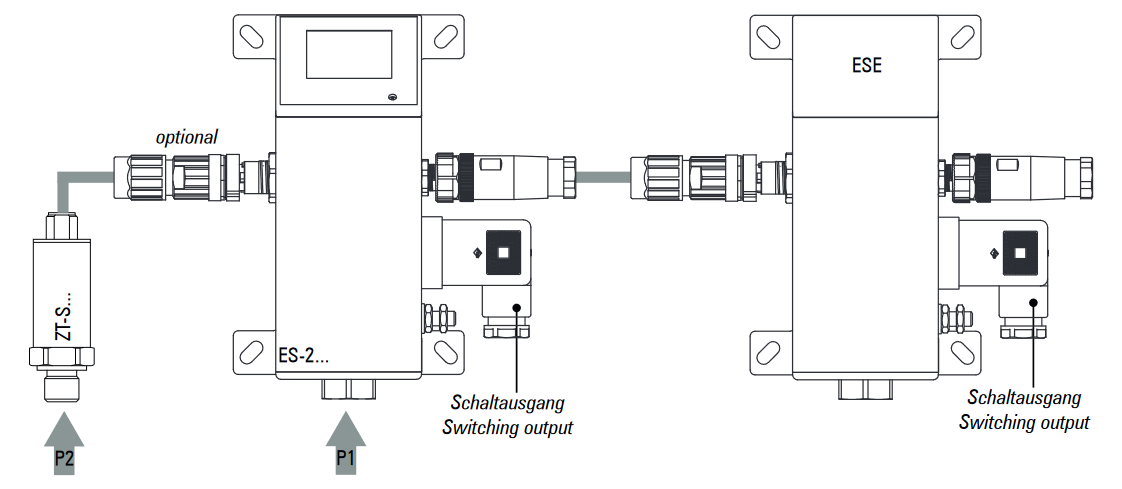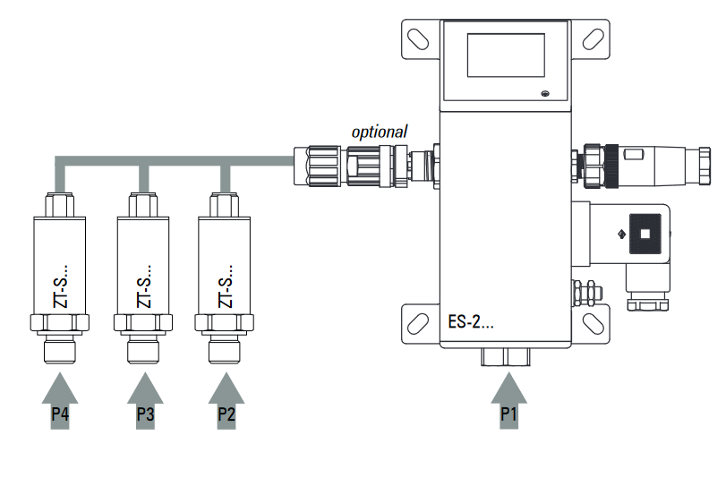 The ES series can be expanded into a central measurement and control system using measuring channel and switching channel extensions. For this purpose, specially developed SIL 2-capable pressure transmitters (ZT-S) are connected to the ES device via a secure communication interface. This enables simultaneous monitoring of up to four pressure circuits.
