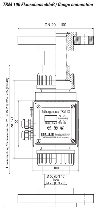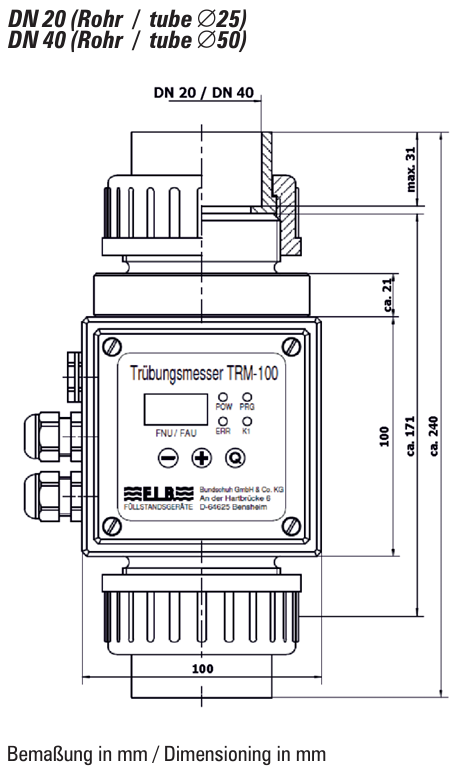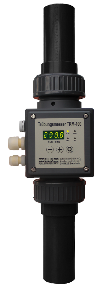 The turbidimeter TRM-100 is a compact device for measuring turbidity in liquids. The "turbidity" is measured using the scattered light method (angle 90 degrees) for the turbidity range of < 1,000 FNU (Formazine Nephelometric Units) and the transmitted light method (angle 0 degrees) for the turbidity ranges > 1,000 FAU (Formazine Attenuation Units).