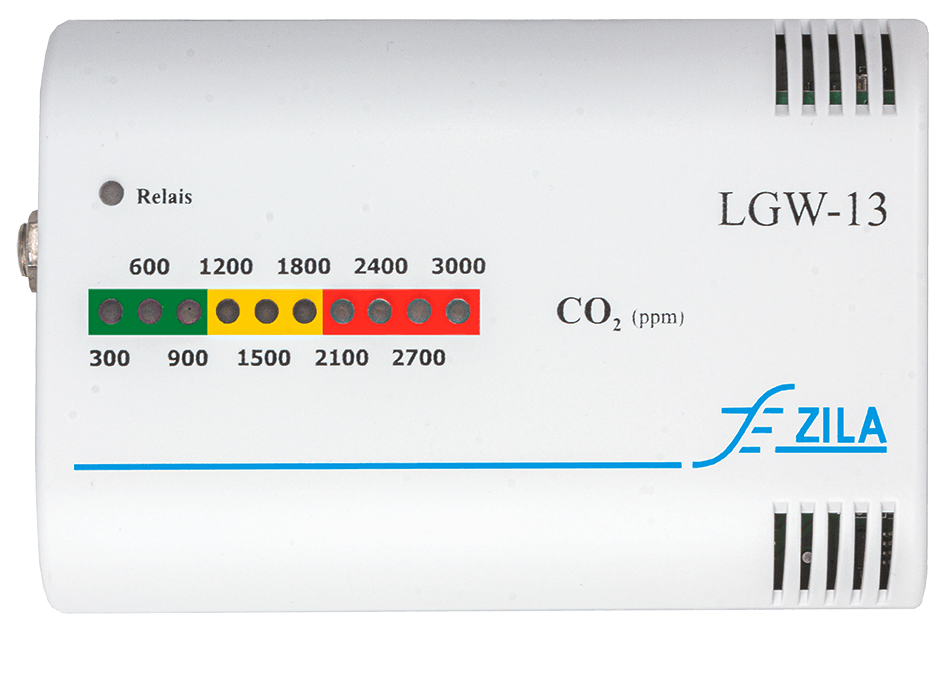 The ZILA air quality monitor LGW-13 for the detection of CO2 was specially designed for measuring and monitoring the room air quality by means of a CO2 sensor. The air quality is shown by a 10-digit display in traffic light form. In addition to the current output and voltage output, the LGW-13 has an acoustic alarm for indoor CO2 measurement. The different outputs, depending on the version ordered (variant S potential-free output only; variant L potential-free output as well as 4...20 mA and 0...10 V output), make the LGW-13 a flexible CO2 measuring device with a wide range of applications.