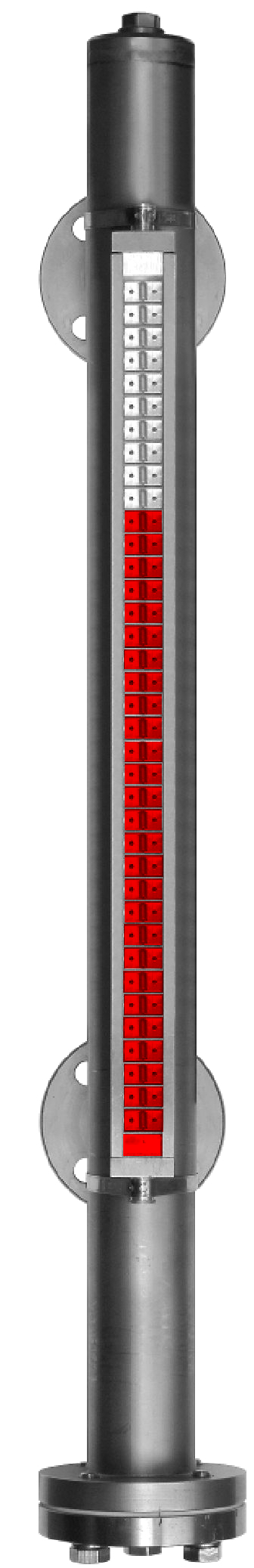 The float has a special round magnet, which rotates 180° about its own axis when the aluminium wafers pass by. The level is easy to read off through the illuminated red colour on the reverse side. The device can be used everywhere where the level of liquid medium has to be exactly monitored, indicated and controlled. This applies particularly to corrosive, toxic and highly combustible liquids. The level indicator is convincing through its simple principle, requiring no power supply and guaranteeing high operating reliability. The level indicator is made of stainless steel, PVC, PP or PVDF. The indicating strips and wafers consist of aluminum and are therefore not susceptible to corrosion. Each wafer has a permanent magnet therefore the indicator is insensitive to vibration. Electrical switching contacts can be fitted to the float chamber in any position during operation. This facilitates optimum definition of the min-max values. Continuous evaluation is possible with the TK-307.