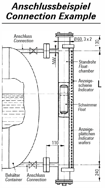 The MKL level indicator is connected by its two connections to the container to be monitored (see connection example). According to the law of interconnected containers the level in the float chamber corresponds exactly to the level in the container