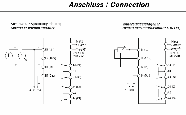 The signal at the input of the limit comparator is compared with switchpoint values which can be adjusted digitally by the user. If this limit values are exceeded or not reached, the respective isolated output contact operates. The output relays of the TK-315 limit comparator operate on an open-circuit current principle. The measuring signal is indicated digitally in %. The TK-315 possesses a wide range power pack and can be operated by 24 V DC to 230 V AC .