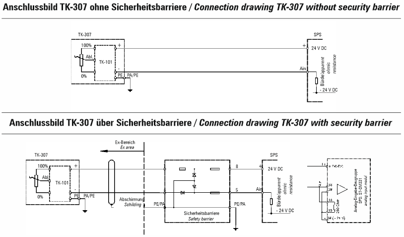 The measuring transducer TK101Ex is also approved for use in explosive atmospheres Ex zone 0 (Cat. 1). For this purpose, the measuring transducer must be supplied with an intrinsically safe control circuit. The resistance signal of the measurement transducer is converted to an unit current signal (4...20 mA).