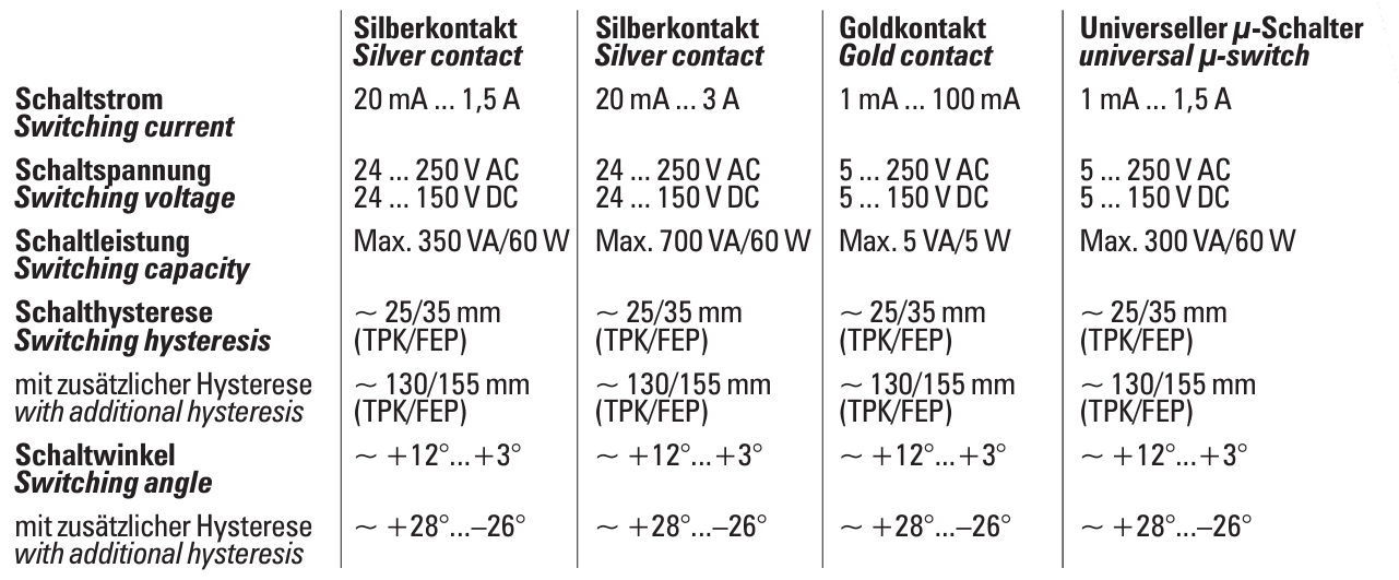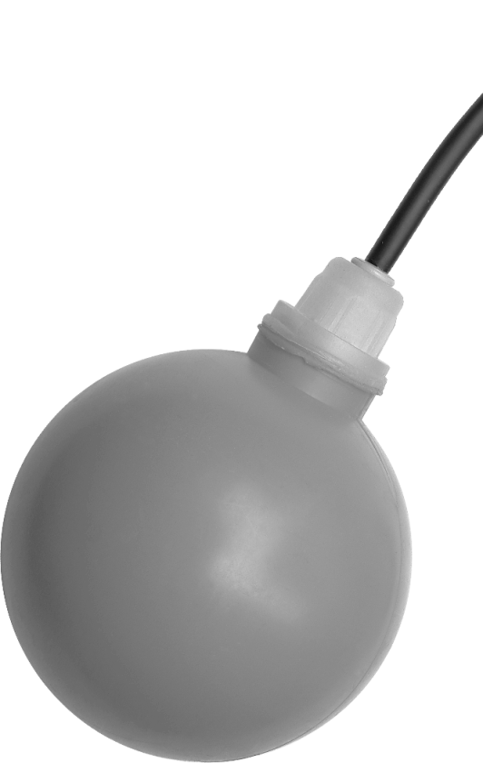 These float switches are characterised by their switching system which works without mercury. The switching system consists of a µ-switch which is operated by a ball and which switches with an angle of approx. +3° / +12° ( without hysteresis) and with an angle of approx. (with –26° / +28° additional hysteresis).