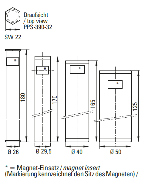 The PPS/PVS-390... Floats are suitable for our W-35... water level indicators and other bypass systems. The matching float must be chosen for the corresponding pipe diameter. The “0” mark represents “up”, the redmark (ring) indicates the location of the integrated magnet (alternatively, the magnet can also be installed on the bottom The float serves as optical indication of the fluid level and actuates at the same time the infinitely variable contacts on the outside (e.g. BK-390-... ). The number of the contacts to be switched can be defined as desired. The floats may not be operated near strong magnetic fields or ferromagnetic parts.