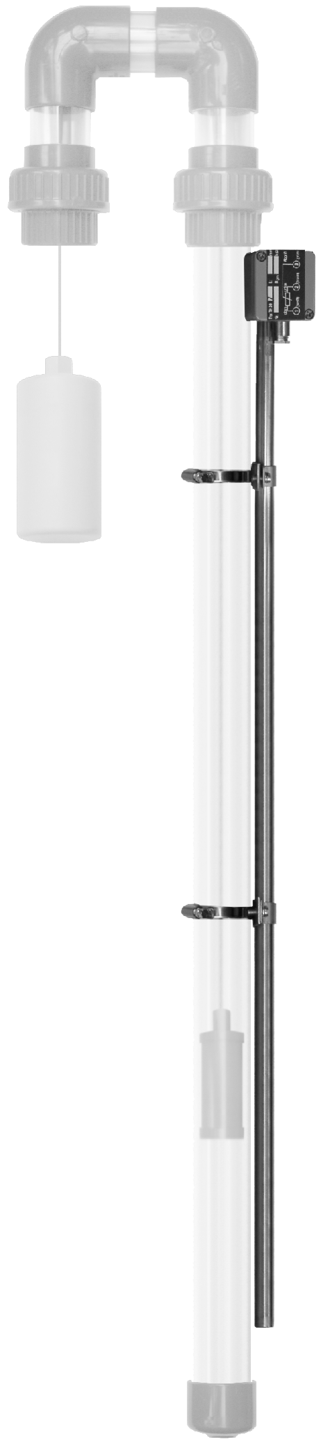 The materials used are PVC, PE, PPH, PTFE, brass or stainless steel (1.4571), depending on the requirements. This makes the magnetic immersion probes suitable for use with highly aggressive media. A ring magnet is built into the float sliding on the guide tube, which switches the reed contacts built into the guide tube with its magnetic field. These reed contacts pick up a partial resistance, which is proportional to the level, from a resistor chain, which is made up of individual resistors. Due to the technology used, the pick-up is quasi-continuous. The contacts are hermetically sealed gas-shielded contacts mounted on a printed circuit board inside the guide tube. The resolution can be adapted to the requirements due to the possible pitches of 7.5/10/15/20 mm or 1%/2%/5%.