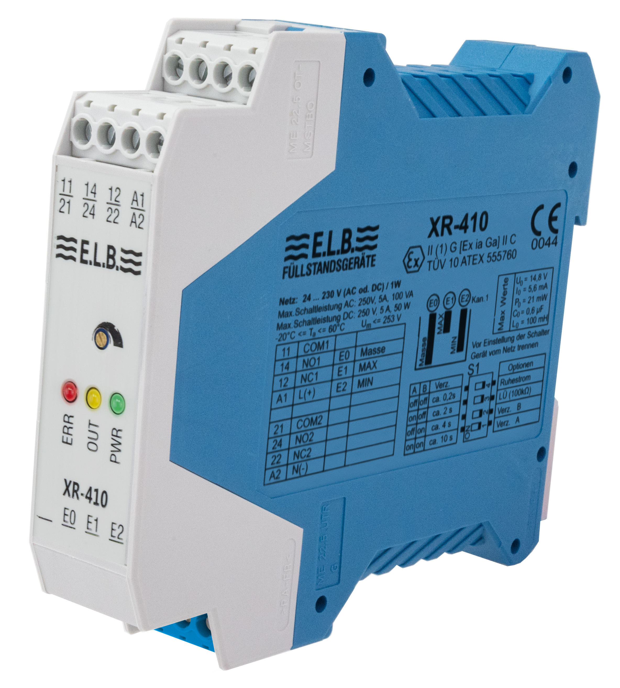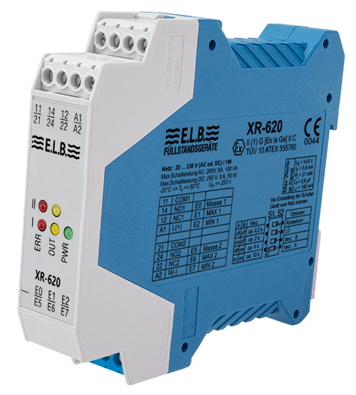 In hazardous areas, the electrode relays serve as an interface (galvanic isolation) between the Ex and non-Ex areas. The intrinsically safe circuit is safely galvanically isolated from the non-intrinsically safe circuit up to a peak voltage value of 375 V. The electrode relays themselves (without additional protective measures) must not be operated in Ex areas. When installed in an Ex-approved enclosure, operation in the Ex-area is possible. The safe isolation has been tested and certified by TÜV.