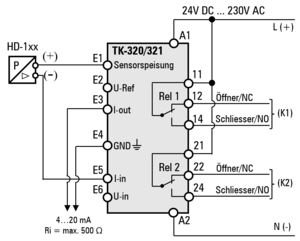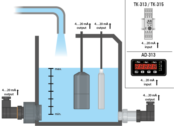 The TK-313 and TK-315 analysers are compact versions for top hat rail mounting. Here the fill level is displayed in %. Furthermore, 2 limit values can be monitored with the TK-313 and four limit values with the TK-315 via relay output.