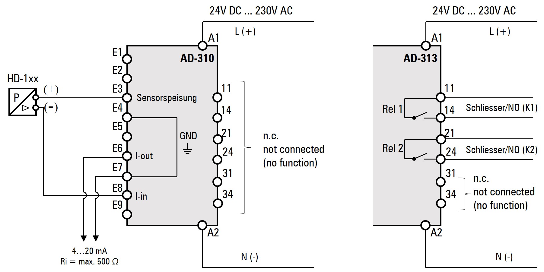 The programmable digital display AD-313 intended for panel mounting enables individual output variables (litres etc.) to be displayed as variables describing the fill level using the scaling function. Adjustable limit values can also be monitored by means of an alarm function as a relay output.