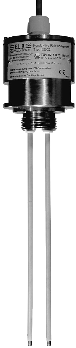 By using the conductive electrodes of our EE-21...F/EE-22...F line you can monitor conductive liquids within zone 0 (category 1). They are also approved by the “DIBt” (German Institute for Structural Engineering) as liquid level limit switches for the overfill protection of containers for storing water-endangering and combustible liquids. The screw connection of the EE-21...F/EE-22...F consists of stainless steel 1.4571. The electrode rods are made of stainless steel, 1.4571, Hastelloy B, Hastelloy C or tantalum. Through this the conductive electrodes EE-21...F/EE-22...F are suitable for use with highly aggressive media. The conductive electrodes of the EE-21...F/EE-22...F line are designed to be mounted within containers, the room inside the container can be classified as Ex-zone 0 (category 1).